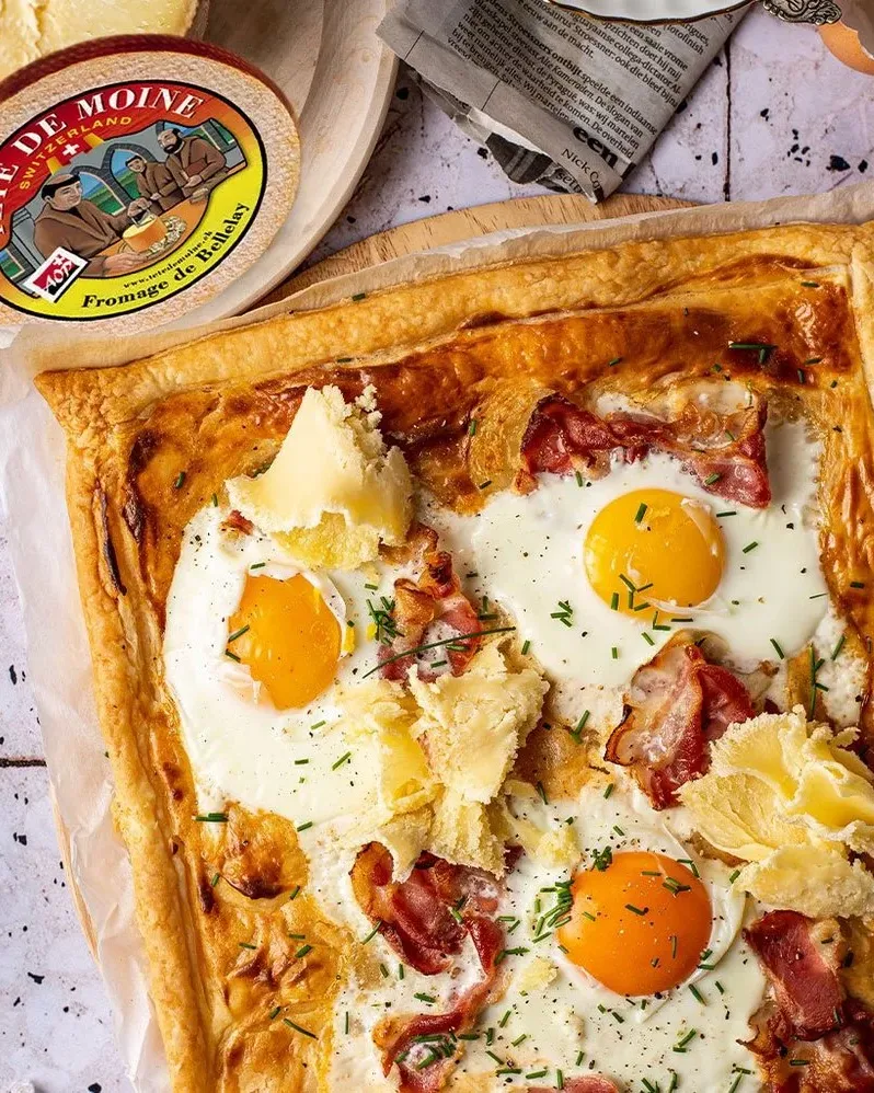 Blätterteig mit Ei, Speck & Käse 🥚🥓🧀 Blätterteig 125g crème fraîche 1 TL Paprika 6 Scheiben Speck 3 Eier Tête de Moine AOP Schnittlauch, Salz und Pfeffer 1️⃣ Crème fraîche mit Paprika mischen und auf den Blätterteig streichen. 2️⃣ Speck darauf verteilen und bei 180 °C 15 Min. backen. 3️⃣ Eier aufschlagen, weitere 10 Min. backen. 4️⃣ Aus dem Ofen nehmen, Tête de Moine AOP-Rosetten darauf verteilen, mit Schnittlauch, Salz & Pfeffer toppen – sofort servieren ✨ — Tarte feuilletée aux œufs, lard & fromage 🥚🥓🧀 Pâte feuilletée 125 g de crème fraîche 1 cc. de paprika 6 tranches de lard 3 œufs Tête de Moine AOP Ciboulette, sel & poivre 1️⃣ Mélanger la crème fraîche avec le paprika et l’étaler sur la pâte feuilletée. 2️⃣ Répartir le lard et cuire à 180 °C pendant 15 min. 3️⃣ Casser les œufs sur la tarte et cuire encore 10 min. 4️⃣ À la sortie du four, ajouter les rosettes de Tête de Moine AOP, parsemer de ciboulette, saler, poivrer et servir immédiatement ✨ @tete de moine #fromagesspielhofer #spielhofersa #tetedemoine